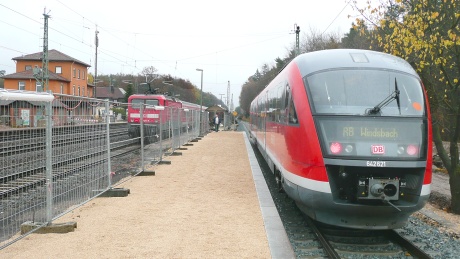 Der Löhe-Express fährt wieder ! Die verlängerten Bauarbeiten in Wicklesgreuth wurden am 8.11.09 beendet, und die beliebten roten Triebwagen der Baureihe 642 fahren seit dem 9.11.09 wieder planmäßig nach Windsbach. Der Nachteil ist aber, dass die Züge nach Ansbach und Nürnberg noch an den alten Bahnsteigen halten. Dadurch verlängert sich der Fußweg um 70 Meter, weil man sowohl zur Treppe als auch zu den Zügen nach Nürnberg um die (noch unveränderte) Unterführung herum laufen muss. Wollen wir hoffen, dass sich das nicht erst in den Sommer-ferien 2010 ändert. Dann soll nähmlich die Strecke Nürnberg- Ansbach komplett gesperrt werden, um die letzten Ausbauten für die S-Bahn in einem "großen Rutsch" zu erledigen. |