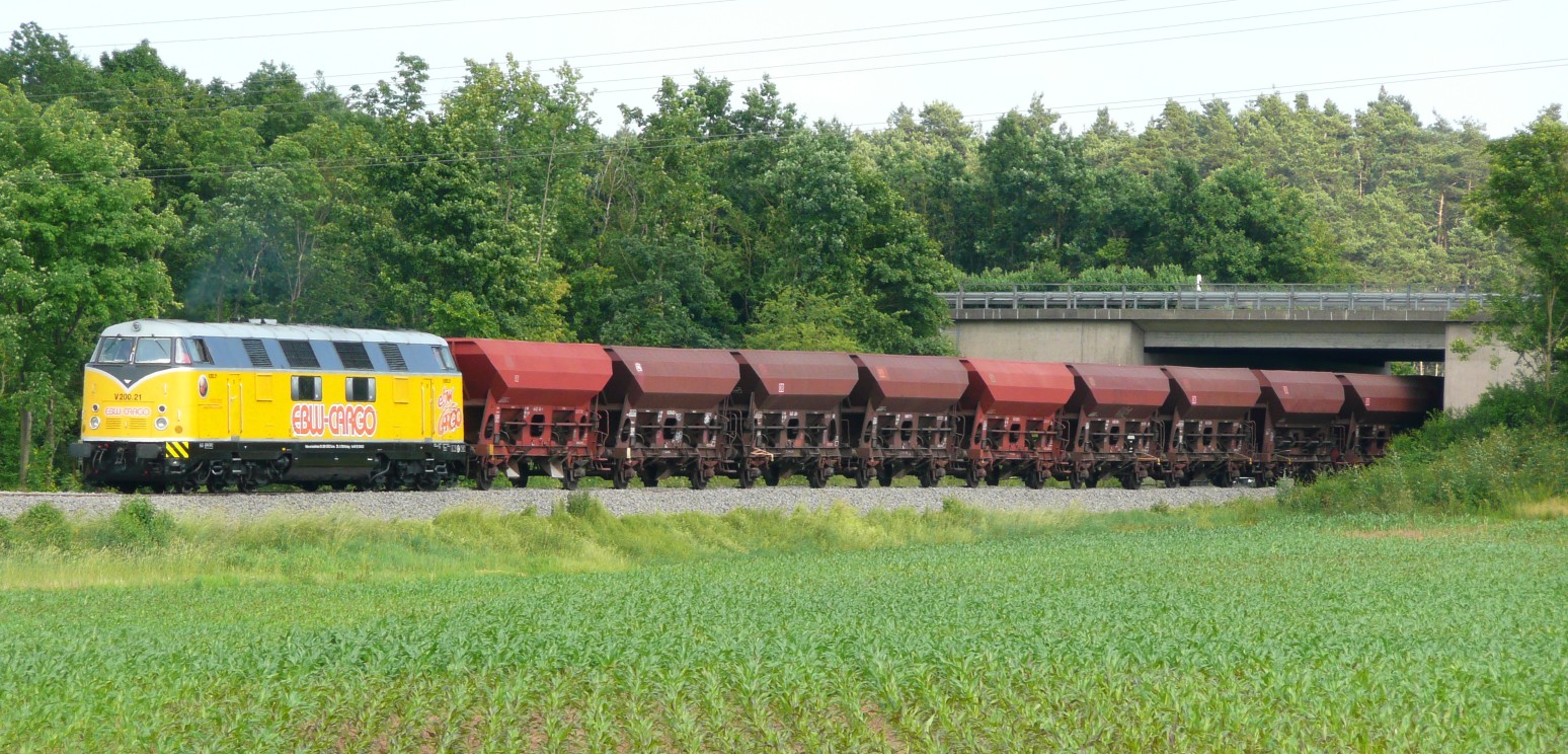 Bei den Bauarbeiten im Juni 2008 kamen bisher letztmals Diesellokomotiven auf die Strecke Wickles-greuth - Windsbach. Am 12.6.08 konnte Jörg Schäfer die 6-achsige V 200.21 von EBW-Cargo nördlich der Autobahn A6 und die vierachsige V 100 von Wiebe-Bau südlich der Autobahn A6 fotografieren.